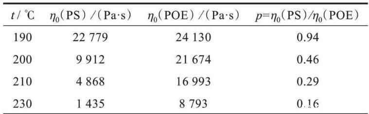 表1不同温度下POE和PS的零剪切黏度和黏度比