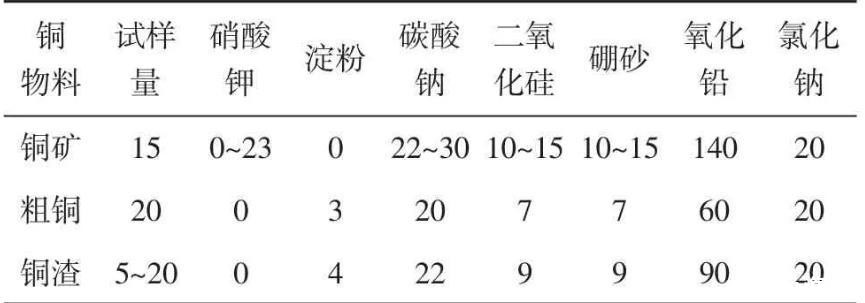 配料前可根据待测物组分确定熔渣的硅酸度,然后计算各熔剂的需要量。同时根据试样还原力试验结果(或理论计算试样的还原力)调整氧化剂或还原剂加入量。通过优选实验,推荐含铜物料的配料可按表1进行。