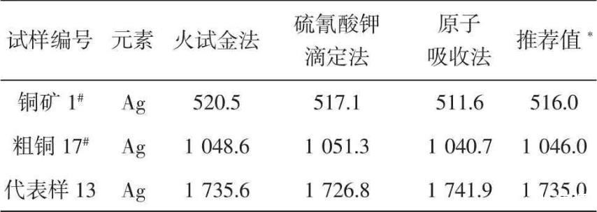按试验方法,用不同含量的铜物料样品进行分析,并与其它测定银元素方法的分析结果对照,结果见表4。