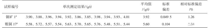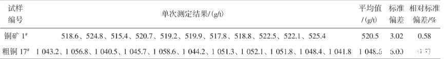 称取20.00 g样品,铜矿、铜渣样直接干法试金配料,按试验方法进行分析,结果见表4和表5。