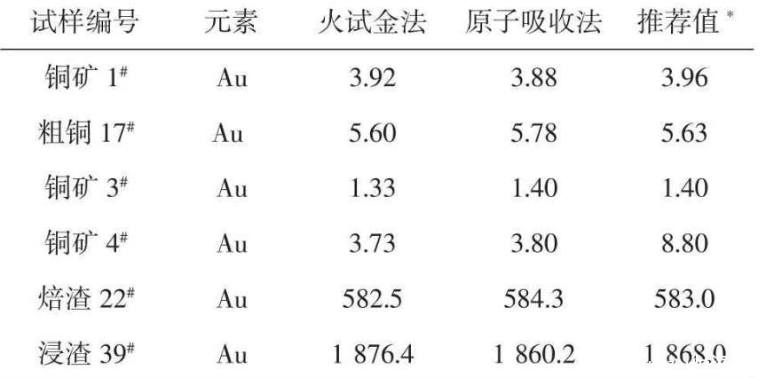 按试验方法,用不同含量的铜物料样品进行分析,并与其它测定金元素方法的分析结果对照,结果见表5。
