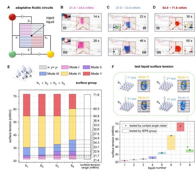注入结构化表面的液体首先填充相邻四个单元间的空隙,并在单元的特定曲率结构处形成局部曲率不等的液体弯月面,这导致液体表面不同位置的拉普拉斯压差不同,进而驱动液体定向运输。随表面张力从低到高(22-72 mN/m),液体呈现出五种不同的运输模式(I至Ⅴ)。研究人员利用水-乙醇溶液对这五种模式下液体沿x轴和y轴方向上的运输行为进行力学分析(图2)。表面张力较低的液体对界面的润湿性较高,因此主要在单元底部曲率结构作用下,沿拉普拉斯压差较低的方向运输;而表面张力较高的液体会在结构化表面上积累,其运输方向由单元顶部曲率调控。
