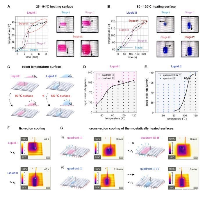图4:高温表面上的动态液体运输控制和时空可控的靶向冷却。