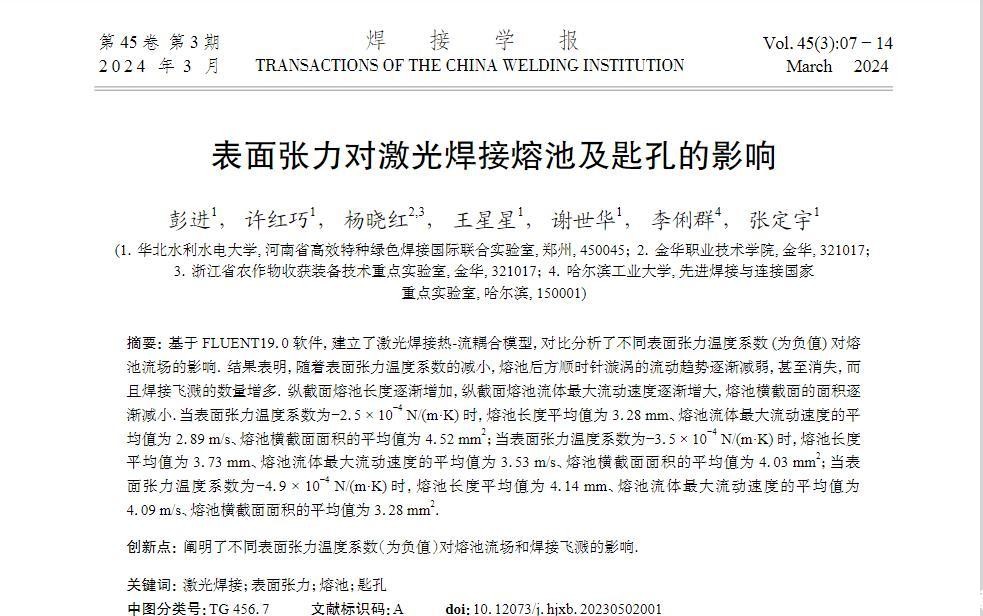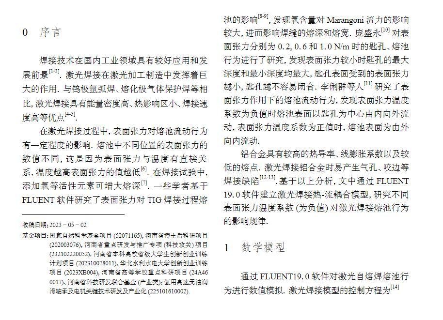 基于FLUENT19.0软件,建立了激光焊接热-流耦合模型,对比分析了不同表面张力温度系数(为负值)对熔池流场的影响。