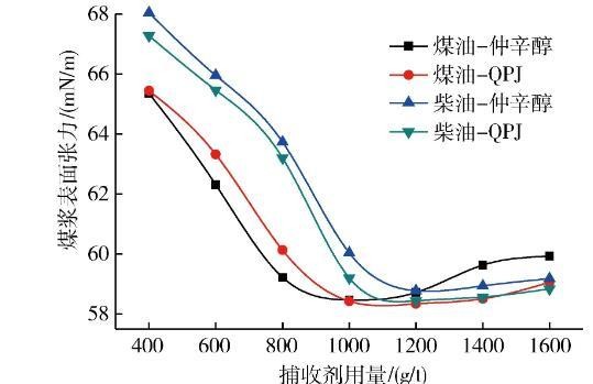 使用QPJ做起泡剂时,煤浆表面张力在煤油用量为1000 g/t时达到最低值,在煤油用量超过1400 g/t后开始明显回升;煤浆表面张力在柴油用量达到1200 g/t时达到最低值,在超过1400 g/t后开始回升。由此可见,捕收剂对煤浆的表面张力有着较为显著的影响。