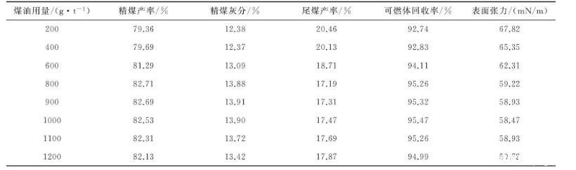 固定仲辛醇(起泡剂)用量为200 g/t,改变煤油(捕收剂)用量,同步进行浮选和表面张力试验,结果见表2。