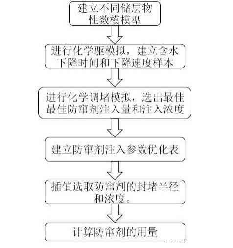 将储层中的有效厚度、净毛比、孔隙度、级差、渗透率变异系数、渗透率、原油粘度、残余油饱和度和油水界面张力对化学剂驱的影响通过含水率下降速度与注入水量这两个综合指标来表征,建立不同注入水量和含水率下降速度样本。然后样本进行化学剂调堵,通过综合增油指标优化选择每个样本的最佳封堵半径和防窜剂浓度,最终建立起封堵半径和防窜剂用量优化表。在使用时仅通过矿场生产过程中的含水率下降速度与注入水量就可以得到防窜剂用量、防窜剂浓度和封堵半径。克服了示踪剂检测等传统方法实施难度大、成本高的缺点。