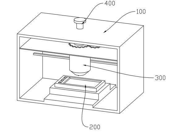 图中:100、外壳;101、第一隔板;102、第二隔板;110、第一电机;200、涂片台;210、台体;220、承载板;230、推板;300、滴液机构;310、滴液筒;311、出液口;312、第二气口;320、副筒;330、外筒;331、进气口;340、滴液腔;350、第一空腔;360、混合筒;361、第一气口;370、第二空腔;400、排气机构;410、排气板;411、排气口;420、转动板;421、把手。