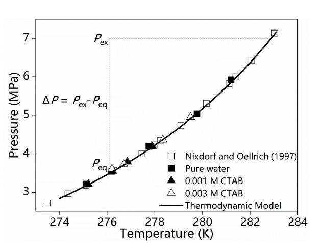 图1.甲烷水合物在纯水与表面活性剂溶液中的相平衡条件