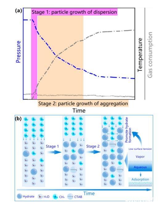 结合微观与宏观尺度的实验结果,该研究总结出两阶段水合物生长模式——第一阶段为颗粒分散生长过程、第二阶段为颗粒聚集生长过程(图2)。