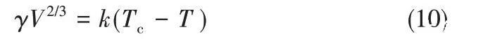 式中,γ是样品在温度T下测得的表面张力;V是液体的摩尔体积;Tc是临界温度;k是经验常数。将实验值γ和V2/3的乘积相对于热力学温度T进行线性回归,并获得一条直线,从直线和截距的斜率,可以得到k和Tc的值。对于大部分有机液体来说,k大约为2.1×10-7J·K-1,而对于简单熔盐,k比较小,NaCl的k≈10-7J·K-1。