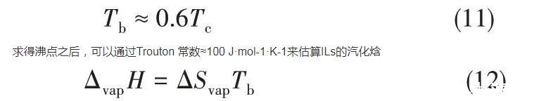 2008年,Verevkin[71]开发了一种基于经验公式的简单相加法来计算ILs的蒸发焓,该焓被分解为构成元素的主要成分和辅助成分的校正(基于结构上的特殊性,例如CF3基团或环状结构的存在)