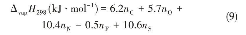 2005年,Kabo等[37]用Knudsen渗流法测出了[C4mim][Tf2N]的蒸气压,从而计算得到汽化焓,Kabo等基于有效原子的相加性提出式(9)计算298 K的汽化焓