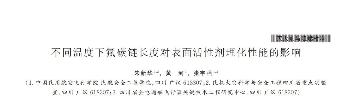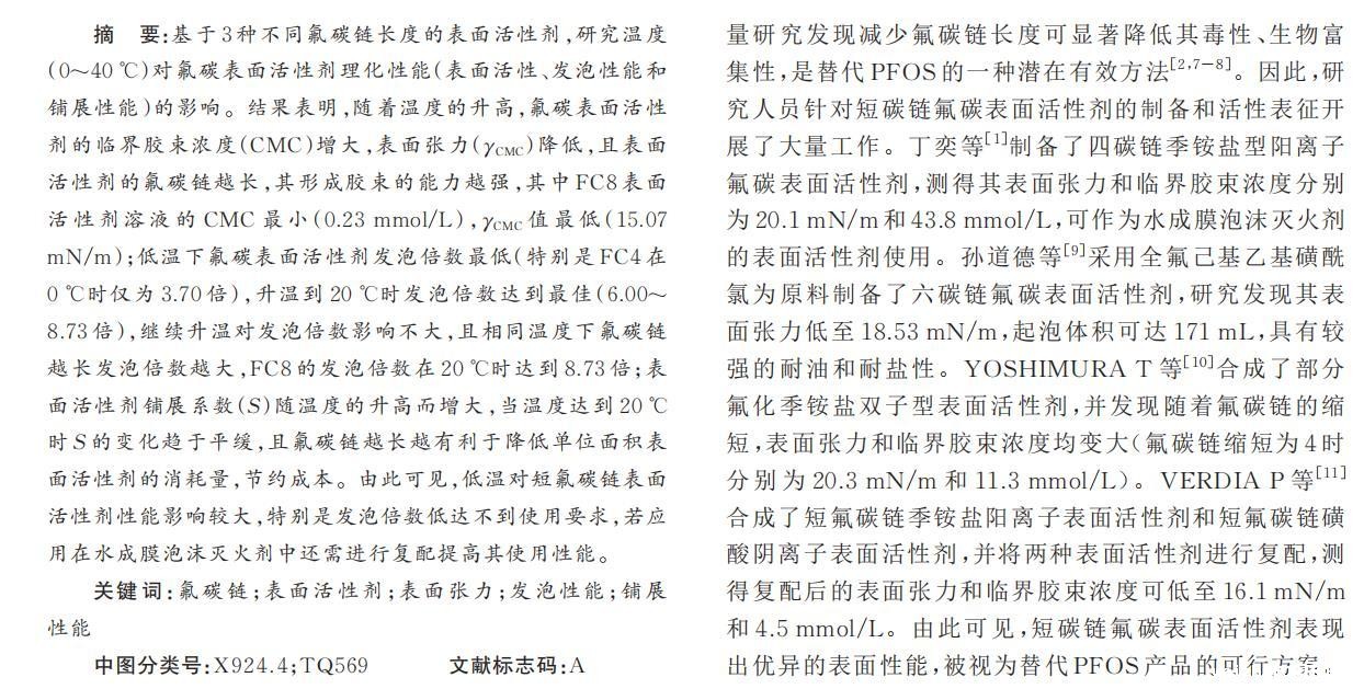 基于3种不同氟碳链长度的表面活性剂,研究温度(0——40℃)对氟碳表面活性剂理化性能(表面活性、发泡性能和铺展性能)的影响。