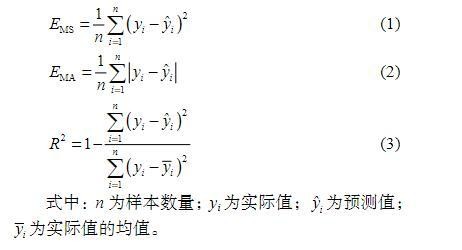 按照8∶2的比例将实验数据划分为训练集和测试集,对每个模型进行训练,并在测试集上进行验证。这里选用3种常用于回归任务的评价指标:均方误差(MSE)、平均绝对误差(MAE)和决定系数(2)。MSE和MAE可以衡量预测值与真实值之间的误差,数值越小表示模型预测的越准确;2度量模型拟合数据的程度,取值范围在0到1之间,越接近1表示模型对数据的拟合程度越好。这3个评价指标的计算公式如下所示: