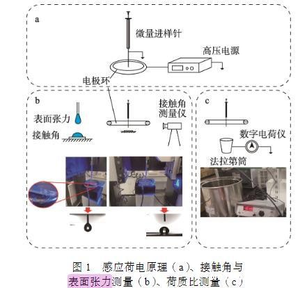 图1感应荷电原理(a)、接触角与表面张力测量(b)、荷质比测量(c)
