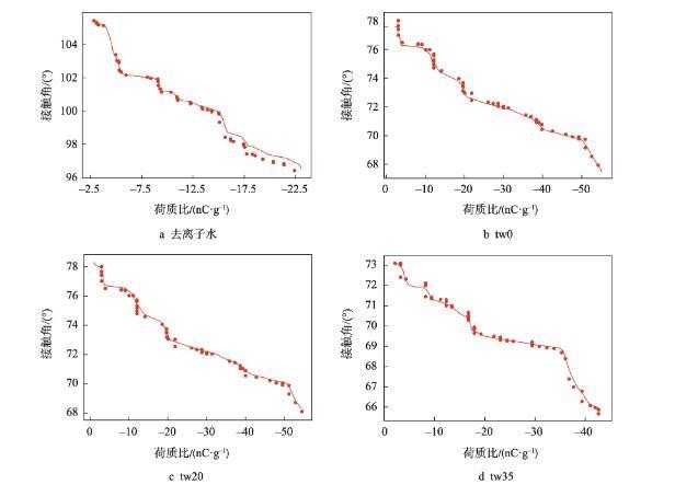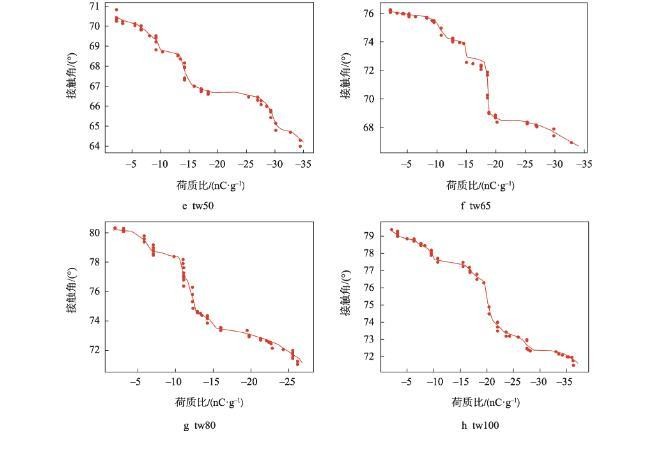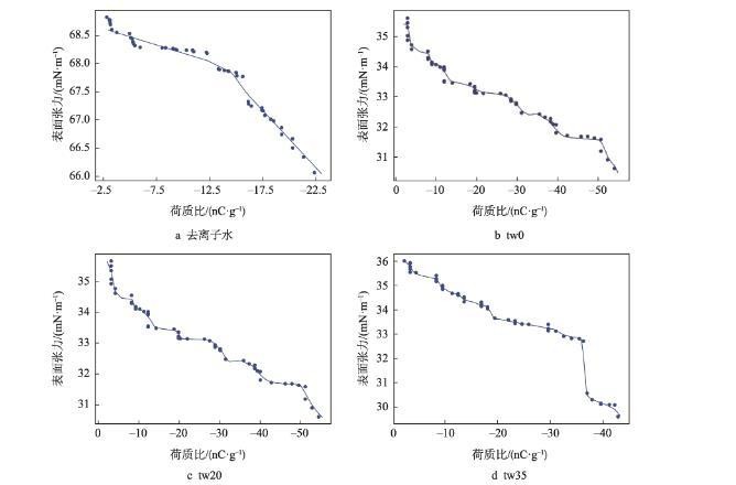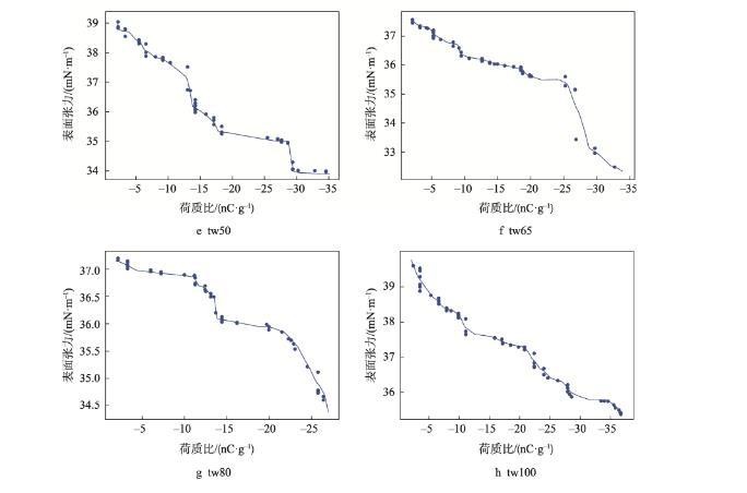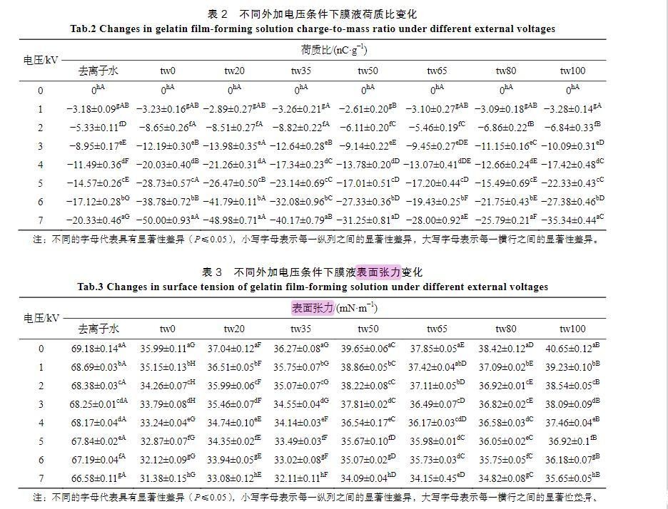 随着膜液中吐温20的减少和司盘20的增多,明胶液滴荷质比亦呈增高趋势(<0.05)。张建桃等[13]研究表明,介质的电导率改变会引起其荷电性能的改变。相同质量浓度下司盘20的物质的量浓度更高,导致溶液电导率及液滴荷质比增加更为明显。然而,与只添加吐温20的明胶溶液(tw100)相比,少量司盘20的添加(tw80)还会引起荷质比的显著减少(<0.05),推测这是由于溶液中吐温20与司盘20分子通过“经典疏水作用”在水溶液中优先结合,从而使溶液中总溶质相对浓度下降导致[14]。
