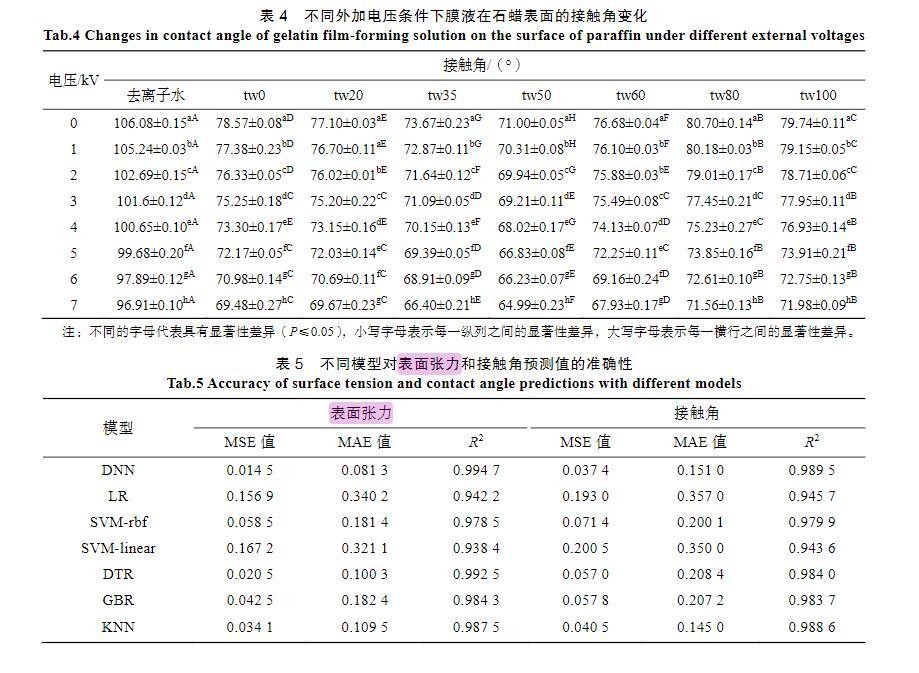 本文探究了在不同电源电压下通过感应荷电的方式对明胶液滴荷质比、表面张力及接触角的影响,并通过深度神经网络建立模型预测。结果发现,静电荷电能有效提高明胶液滴的润湿性能,当外加电压为7 kV时,明胶成膜液滴的表面张力可以下降9%~14%,接触角能够下降8%~12%。从而为形成更均匀、更完整的可食性涂膜提供新的手段。在明胶的质量分数为3%、表面活性剂的质量分数为0.05%、吐温20与司盘20浓度比为1∶1、电压为0~7 kV时,深度神经网络模型对膜液荷质比与表面张力或接触角的关系具有良好的预测作用,可用于指导实践操作。