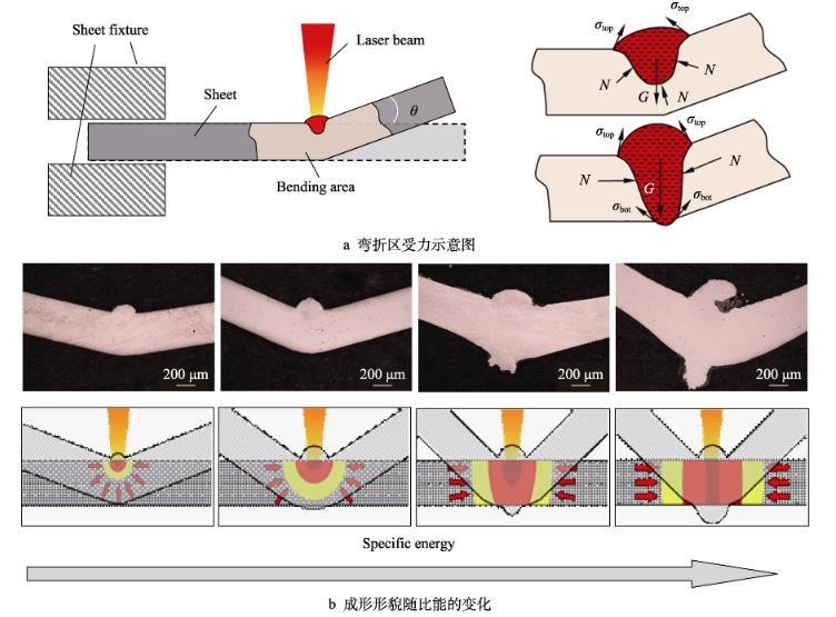 采用高速相机拍摄成形过程中热输入和弯曲角度对弯折区的宏/微观形貌的作用效果,并采用共聚焦显微镜观察试样的宏观形貌,采用光学显微镜分析微观组织,通过维氏显微硬度计测量弯折区附近材料的硬度分布情况,同时结合温度场数值模拟和表面张力理论分析,揭示弯折区形貌的影响因素及形成机制。