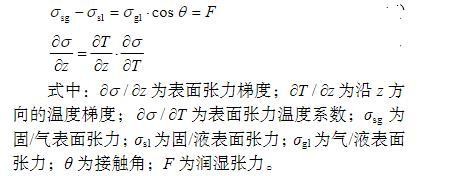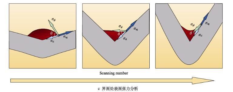 通过对成形过程弯折区域材料的温度梯度和界面表面张力进行分析可知,激光热应力成形界面处的表面张力与润湿角θ的关系可用杨氏方程表示,见式(1)。在成形结束后,界面表面张力的矢量和为零,同时熔凝层表面张力与温度梯度存在如式(2)所示的关系。