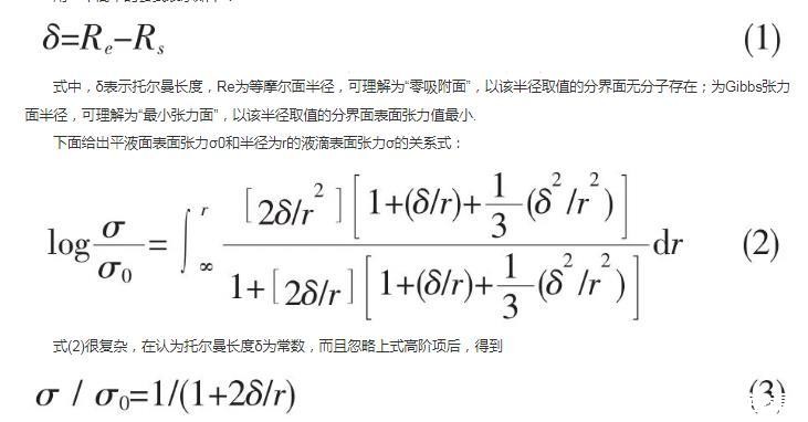 由式(3)发现,当δ与液滴半径在同样的数量级时,表面张力所受影响将非常大,δ所遵从的规律及其与其它物理参量的关系,比如说等温压缩率的关系等,是当前热点问题。从理论和实验角度都有必要开展相应的工作。