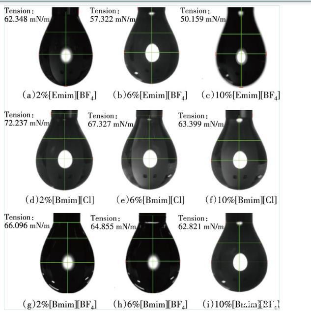 1)表面张力测试。在室温为25℃的环境中,利用电子天平将[Emim][BF4]、[Bmim][Cl]、[Bmim][BF4]分别配制质量分数为0.6%、0.7%、0.8%、0.9%、1%、2%、3%、4%、5%、6%、7%、8%、9%、10%的活性水溶液,测定不同质量分数下离子液体溶液的表面张力3次,取平均值。