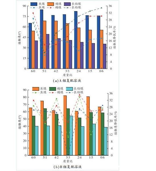 1)与纯水相比,复配后的A、B 2组溶液的接触角明显降低,对于焦煤、褐煤、长焰煤,B组溶液复配质量比为2∶4时接触角降低最多,分别为31.131%,27.969%、14.713%;对于焦煤,A组溶液复配质量比为6∶0时接触角降低最多,为26.452%,对于褐煤、长焰煤,A组溶液复配质量比为1∶5时接触角降低最多,为25.982%、20.026%。