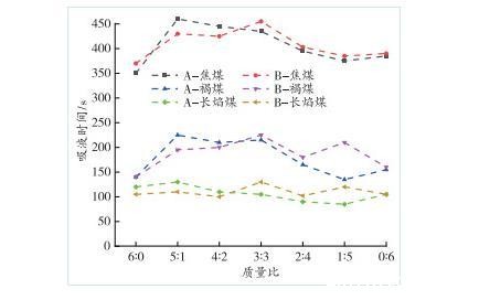 图6为A、B组复配溶液与3种煤样接触角的对比图,不同煤样吸液时间变化情况如图7所示。