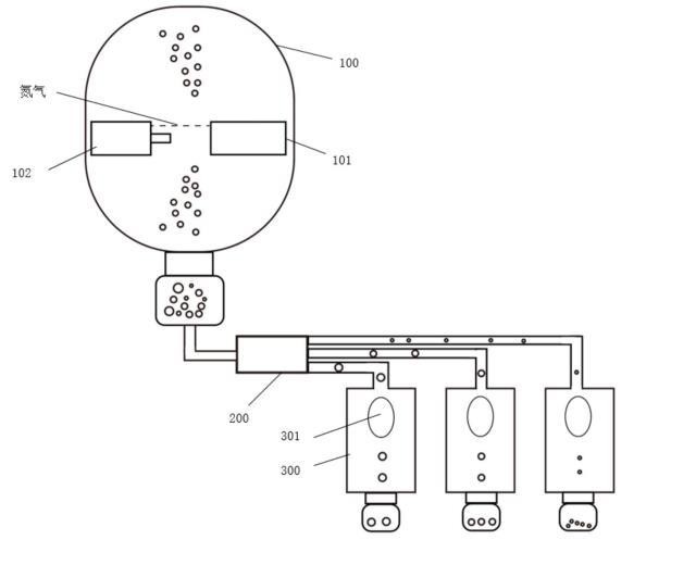 所述后处理装置300内设有等离子体热源301,且所述后处理装置300内充有氮气,经所述粉末分离装置200分离出来的粗粉进入所述后处理装置300内。利用所述等离子体热源301和所述氮气对所述粗粉进行重熔增氮处理,其中,所述粗粉可以是指粒径大于50微米的粉末。