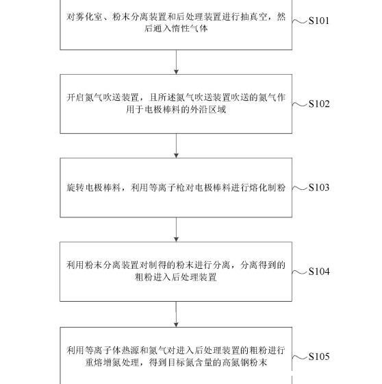S105,利用等离子体热源301和氮气对进入后处理装置300的粗粉进行重熔增氮处理,得到目标氮含量的高氮钢粉末。