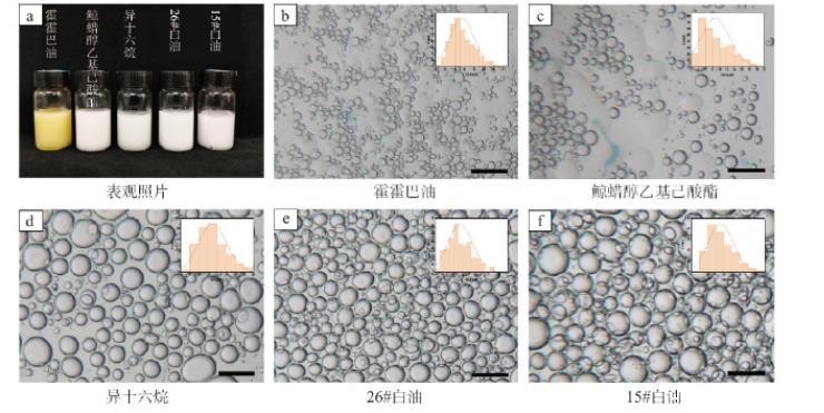 图2不同油脂制备的W/O型Pickering乳液的表观照片、微观照片及粒径分布图:a.表观照片;b.霍霍巴油;c.鲸蜡醇乙基己酸酯;d.异十六烷;e.26#白油;f.15#白油;所有比例尺均为50μm