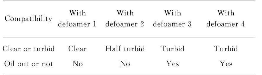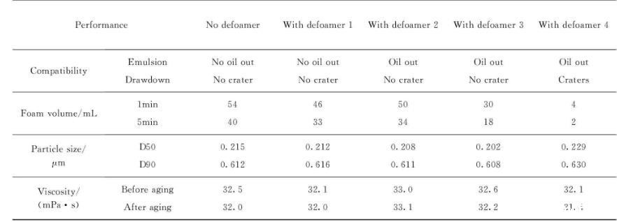 消泡剂的消泡能力与乳液的相容性成反比关系。消泡剂1和2与乳液的相容性最好,但因为部分溶解于乳液中,使消泡强度减弱;而消泡剂4与乳液的相容性最差,虽然具有极强的消泡性,但是因为过于疏水而难与乳液相容,所以容易造成表面缺陷。消泡剂3与乳液的相容性与消泡能力较为平衡,是最佳的消泡剂选择。