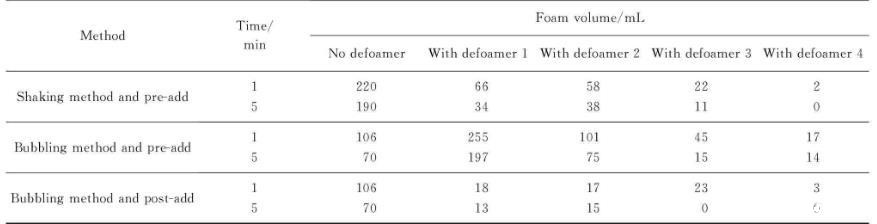 用鼓气法研究了不同的消泡剂添加方式,由表1可以发现后添加方式比先添加方式的初始泡沫明显降低。后添加方式的消泡剂大量聚集于泡沫表面,破坏了气液界面的平衡。虽然在实际生产过程中以先添加方式为主,但试验结果给出了制备工艺改进的思路。