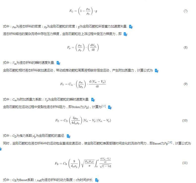 对于液态钎料熔池中存在复杂流场,金刚石颗粒上浮过程中存在重力和浮力的共同作用,计算公式为