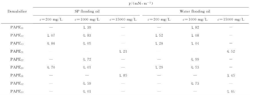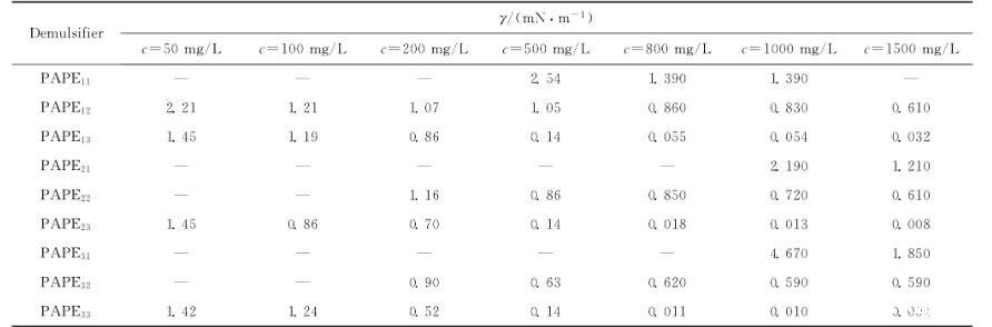 (1)在实验范围内,9种PAPEmn破乳剂均能够有效降低孤东二元驱原油体系油-水界面张力,而且其降低油-水界面张力的能力要显著强于一些常规破乳剂。