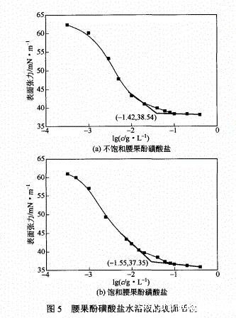 (2)滴体积法测定表面活性结果表明,两种腰果酚磺酸盐具有良好的表面活性,饱和腰果酚磺酸盐的表面活性优于不饱和腰果酚磺酸盐。