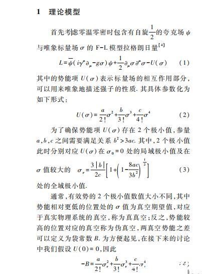 本文具体采用的模型是具有夸克禁闭性质的Friedberg-Lee模型(F-L Model)。F-L模型最初用于描述低能时强子的行为,将强子看做真空中的袋状孤子解,为QCD理论中的禁闭行为提供了非常直观的物理解释。不仅如此,该模型也被扩展至有限温度密度下夸克物质的退禁闭相变的研究,提供了研究夸克强子相变性质的有利手段。但是该模型只能给出有限温度密度下夸克物质一级相变的结果,无法讨论平滑过渡(Crossover)相变和相临界截点相关的物理问题,具有一定局限性。不过本文主要研究夸克强子一级相变下气泡或液滴的动力学问题,F-L模型是比较合适的模型。