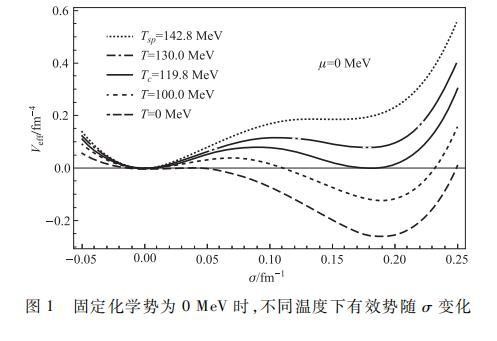 为了更加准确地描述夸克-胶子等离子体(Quark-Gluon plasma,QGP)与强子物质之间的相变特征,在温度密度有限的情况下,通过严格的数值方法,固定化学势为μ=0 MeV,作出如下有效势Veff随σ场变化的函数关系图像。其中,由上至下曲线的温度依次设定为T=142.8,130.0,119.8,100.0以及0 MeV.如图所示,在温度相对较低时,每条势能曲线都具有两个极小值和一个极大值,一个极小值位于σ较小的σ0处,另一个极小值位于σ较大的σv处,其间存在一个局域极大值,对应两极小值之间存在的势垒。