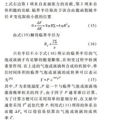 时~R3的效应更明显。对于由涨落产生的半径小于某一特定半径Rc的气泡或液滴,表面张力的效应强于体积能效应,其将在表面张力作用下不断收缩直到消失;但对于半径大于Rc的气泡或液滴,体积能效应强于表面张力的效应,此时气泡或液滴将不断膨胀直至充斥整个空间,原本的伪真空背景将被真真空所取代,完成了相变过程。上述特殊的半径Rc称为临界半径。在我们所研究的体系中,我们主要考虑热涨落效应而忽略量子涨落效应。