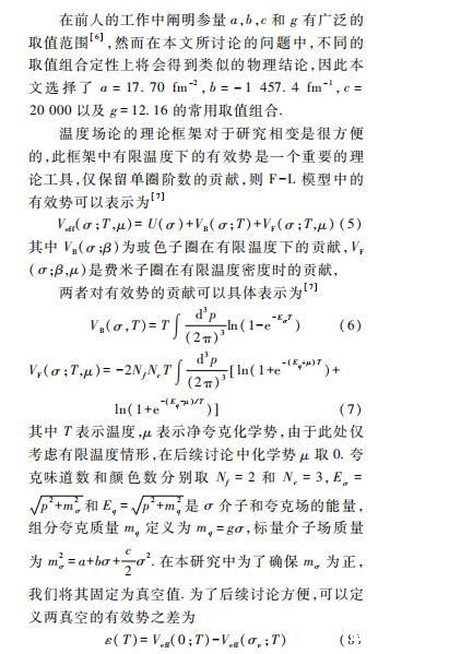 由于气泡或液滴只有在一级相变过程中才会出现,而F-L模型将复杂的胶子场简化为易处理的标量场进行唯象地描述,能够抓住夸克物质一级相变中气泡或液滴动力学中的关键物理性质,同时带来非线性动力学场方程求解上的极大简化,因此本文采用F-L模型。虽然在研究QCD的有效模型中还有各种手征模型,但是考虑到其具有同位旋内禀自由度,对应气泡或液滴的动力学场方程将变得更为复杂,我们将在未来的工作中进一步考虑这些问题。
