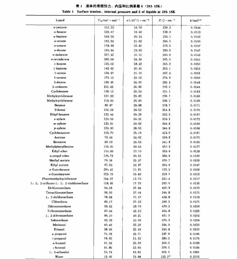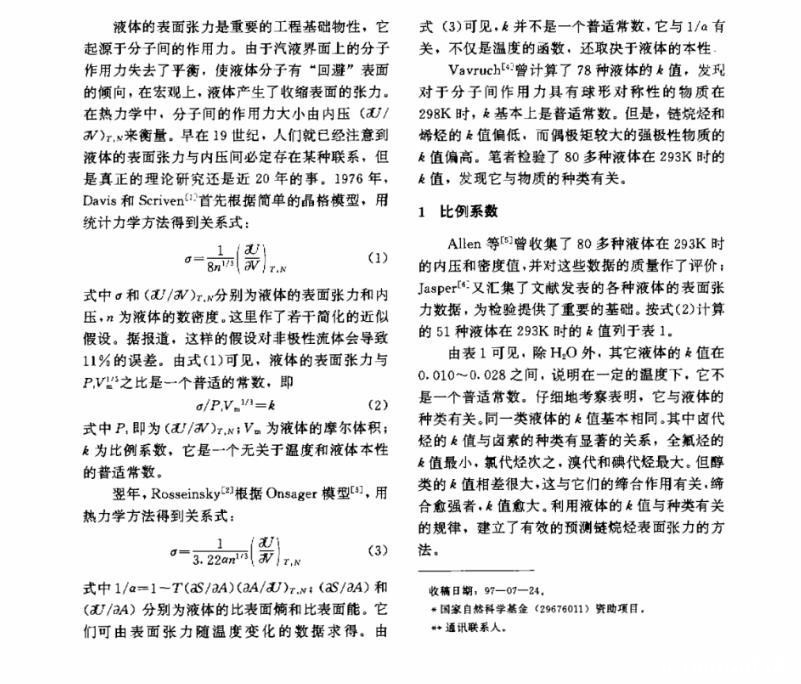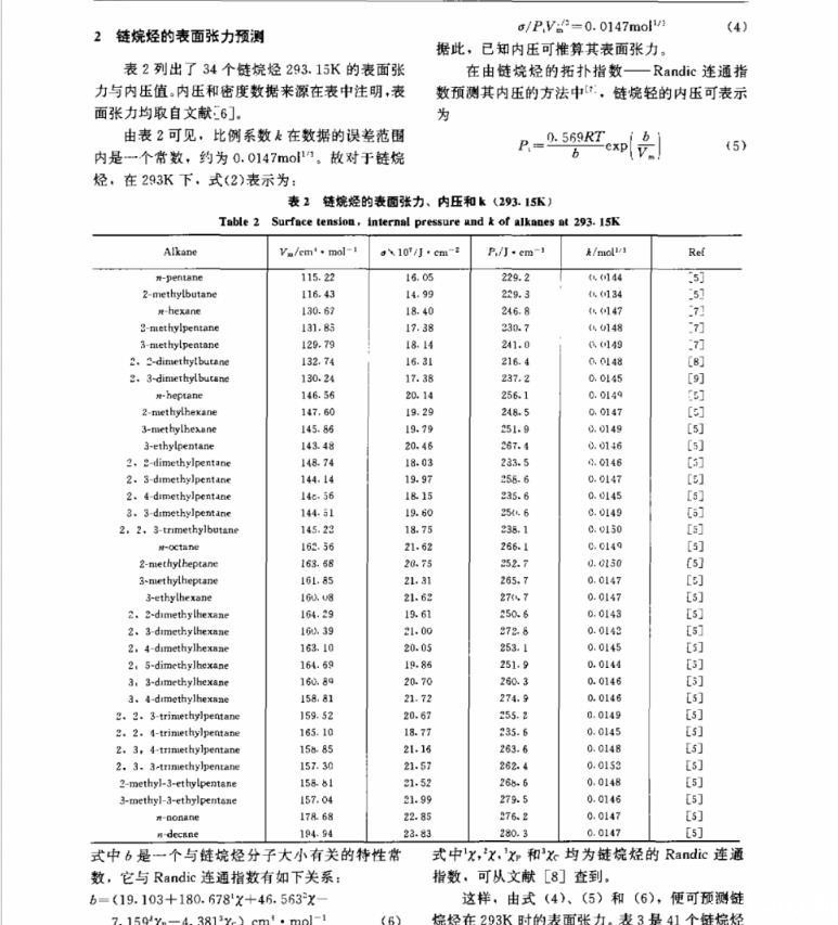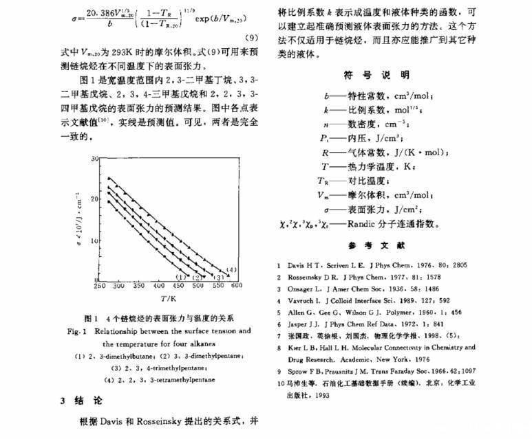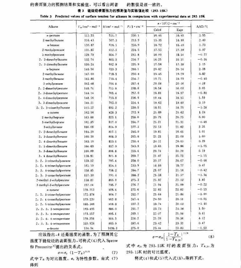 对Davis和Rosseinsky提出的关系检验表明,液体的表面张力σ与P1Vm1/3之比不仅取决于温度,还与液体的种类有关,据此,建立了一个能由链烷烃的分子结构准确预测其表面张力的方法。