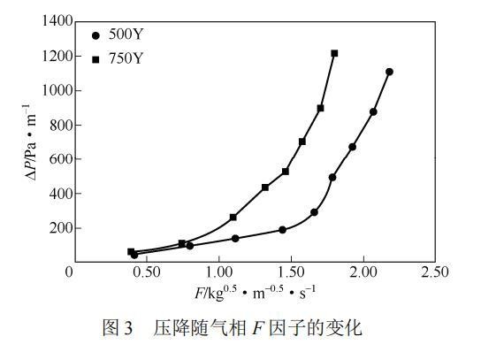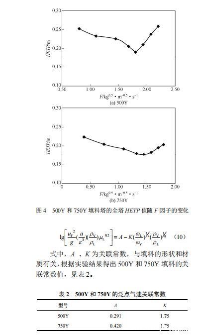 (1)在一定负荷范围内,750Y填料的分离效率优于500Y填料,但单位填料高度的压降高于500Y填料,导致操作稳定性比500Y填料差,处理量比500Y填料小。