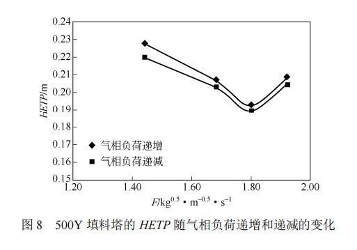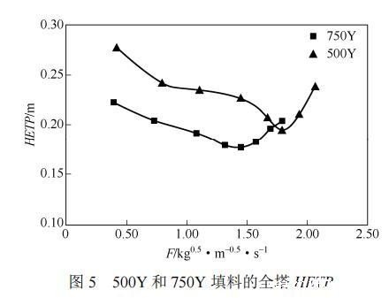 图5表示500Y和750Y填料塔HETP值随气相F因子的变化。由图5可以看出,泛点以下,两种填料的HETP随气相F因子的增大而减小,即传质效率随气液相负荷的增加而升高;泛点以上,两种填料的HETP随气相F因子的增大而增大,即传质效率随气液相负荷的增加而降低。这是因为泛点以下,随气相负荷的增大,气相传质系数和传质界面积均增大。全回流条件下,液相流速和气相流速变化一致,气相负荷增大时,液相负荷也增加,大液量提高了填料的润湿率,增加了有效传质界面积;另一方面高气速增加了液膜的湍动,也会增加有效传质界面积。