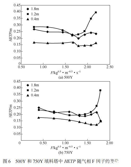 实验测定了回流量从小到大直至液泛的流体力学性能和传质性能,得到了液泛时的实验数据,给定了操作的极限。图4(a)为500Y填料塔的全塔传质效率随气相F因子的变化,从图中可以看出随F因子的增大,HETP先下降后升高,即填料塔的传质效率先升高后下降,在气相F因子为1.8kg0.5/(m0.5·s)附近出现转折。图4(b)为750Y填料塔的全塔传质效率随气相F因子的变化,从图中可以看出随F因子的增大,HETP变化趋势与500Y相似,传质效率先升高后下降,转折点在F因子等于1.5kg0.5/(m0.5·s)附近。