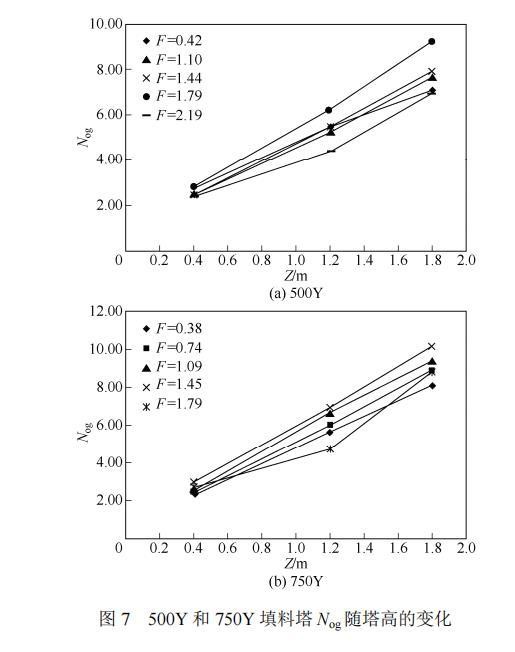 图7为500Y和750Y填料塔中Nog随塔高的变化。由图7(a)可以看出,大多数情况下500Y填料塔中Nog随塔高的变化为一条直线,即总体积传质系数沿塔高不发生变化。这是因为在适宜的操作范围内,塔内流动状态比较稳定,气相负荷一定时,气相传质系数不变。正庚烷-甲基环己烷为纯有机物系,表面张力中性体系,塔内形成的微弱的正表面张力梯度有利于液膜的稳定,从而使有效传质面积保持恒定。由此可以推测,对有机负体系而言,负的表面张力梯度会引起液膜沿流动方向不断破碎,造成有效传质面积的减小,因此Kya随塔高下降不断降低。这与耿皎等[18]在直径为30mm的玻璃精馏塔中选用正体系庚烷-甲苯和负体系苯-庚烷的精馏实验得到的结论一致。从图7(a)可得当气相负荷过小或过大时,500Y填料塔中Nog随塔高的变化并不是一条直线,这说明总体积传质系数Kya沿塔高发生变化。当气相负荷很小时,总体积传质系数Kya沿气相流动方向减小;当气相负荷很大时,总体积传质系数Kya沿液相流动方向减小。当流体流量过高或过低时,塔内流动状态极不稳定,过低的气相负荷,使气相传质系数沿气相流动方向减小、气液相接触减弱,即表现为总体积传质系数Kya随塔高增加而减小;而过大的气相负荷,引起液泛,液体积聚在塔上部很难流下,使沿液相流动方向液相传质系数减小、气液相接触减弱,即表现为总体积传质系数Kya随塔高降低而减小。对比图7(a)和7(b)可得,750Y填料塔中总体积传质系数Kya随塔高的变化规律与500Y填料塔一致。