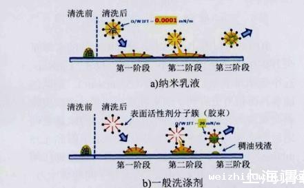 图1纳米乳液和常规表面活性剂除油机理对比
