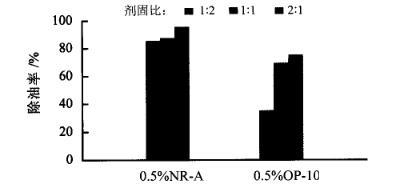从图2的脱附除油率来看,当纳米乳液浓度在0.5%时,除油效果最佳,脱附除油率达到95.7%;当纳米乳液浓度达到5%时,脱附除油下降一半,说明浓度过高的纳米乳液反而降低了它的脱附除油效果;在低浓度下(0~1%),纳米乳液和含油废物按剂固比为2∶1处理含油废物时,脱附效果优于剂固比为1∶1的脱附效果。将0.5%的纳米乳液NR-A与同浓度下的OP-10进行脱附除油对比,实验结果如图3所示。从图3的脱附除油率可以看出,当剂固比为1∶2时,纳米乳液NR-A的脱附除油率(85.49%)是OP-10(34.73%)的2倍多;当剂固比达到2∶1时,纳米乳液NR-A的脱附除油率(95.74%)仍比OP-10(74.1%)高出20%。由此说明纳米乳液NR-A的脱附除油效果远远超过常规表面活性剂。