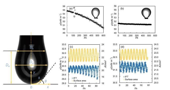 研究团队优化了从样品预处理、仪器改进、实验测量到数据分析的全流程,提供了详细的实验操作指南,涉及液滴控制、系统校准和光学干扰处理等关键步骤。通过对气水两相和气水油三相体系实际测量的有效数据和无效数据的展示和分析,验证了方法的有效性和准确性。整套实验流程可基于不同实际条件在数天内完成。图2动态悬滴表征(左图);界面张力及界面流变性实验测量数据(右图)本研究为界面性质的测定树立了新的标准,通过优化动态悬滴表征方法,极大地提高了测量的可靠性和精度,体现了方法学创新;不仅对界面科学的基础理论发展具有重要推动作用,同时为材料科学、化学工程、环境科学等领域的实际应用提供了技术支撑。