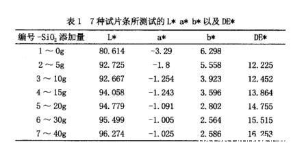 由表1可以看出,选择没用添加二氧化钛的高温尼龙HTN即1~0g做为标准样,并测试其L*,a*,b*数值,2~5g,3~10g,4~15g,5~20g,6~30g,7~40g做为比较样。从数据上进行比较,随着添加量的增加,2号~7号色差DE*逐渐增加,即试样表现得越来越白,2号~3号添加量增加5g,虽然L*值变化不明显,但是b*值变化还是蛮大的,此比例不能说明添加量已经达到饱和状态。4号~5号添加量增加5g,L*数值变化0.7,5号~6号随着添加量继续增加10g,L*数值只变化0.7,说明随着二氧化钛添加量的增加,体系所表现的颜色趋于饱和。
