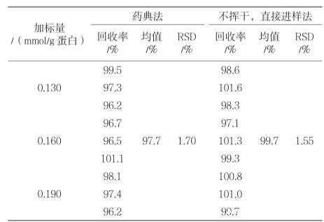 由表3可知,药典方法测得的9次回收率的平均值为97.7%,RSD值为1.70%;不挥干,直接进样法测得的9次回收率的平均值为99.7%,RSD值为1.55%。对两组数据进行单因素方法分析,F=7.530,P=0.02<0.05,两组数据有显著性差异。方法优化后准确度更接近100%,这是因为优化后的方法不受挥干速度的影响[3],进样溶液比药典方法均匀,损失量相对较小。